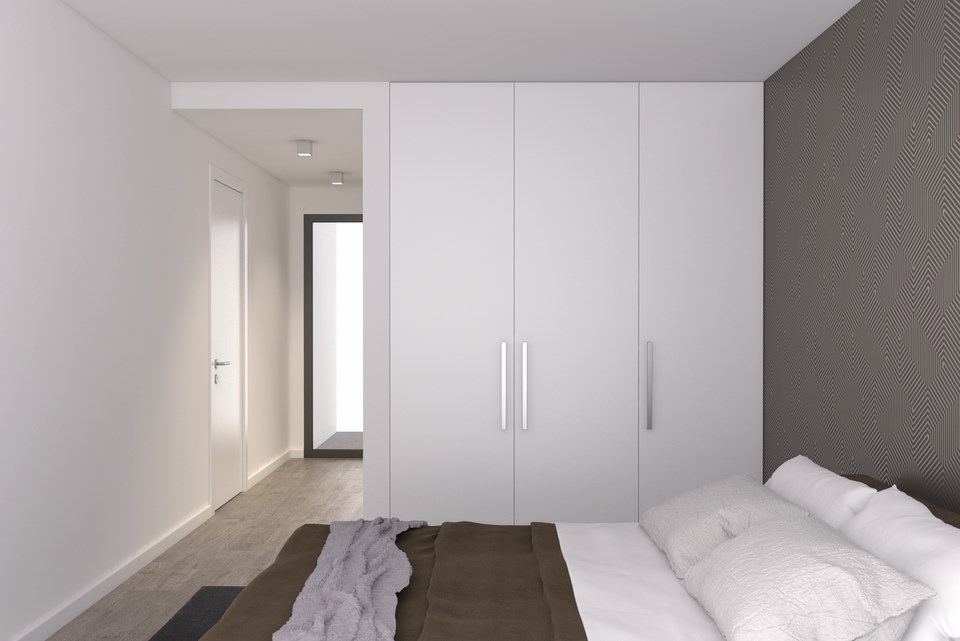 - Roupeiros brancos, forrados e divididos com parteleiras gavetas e varões.