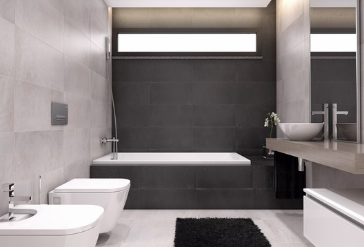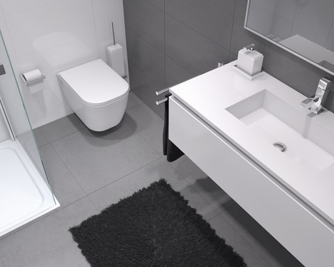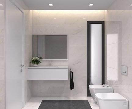 - Móveis suspensos com design moderno com tampos em pedra natural polida;