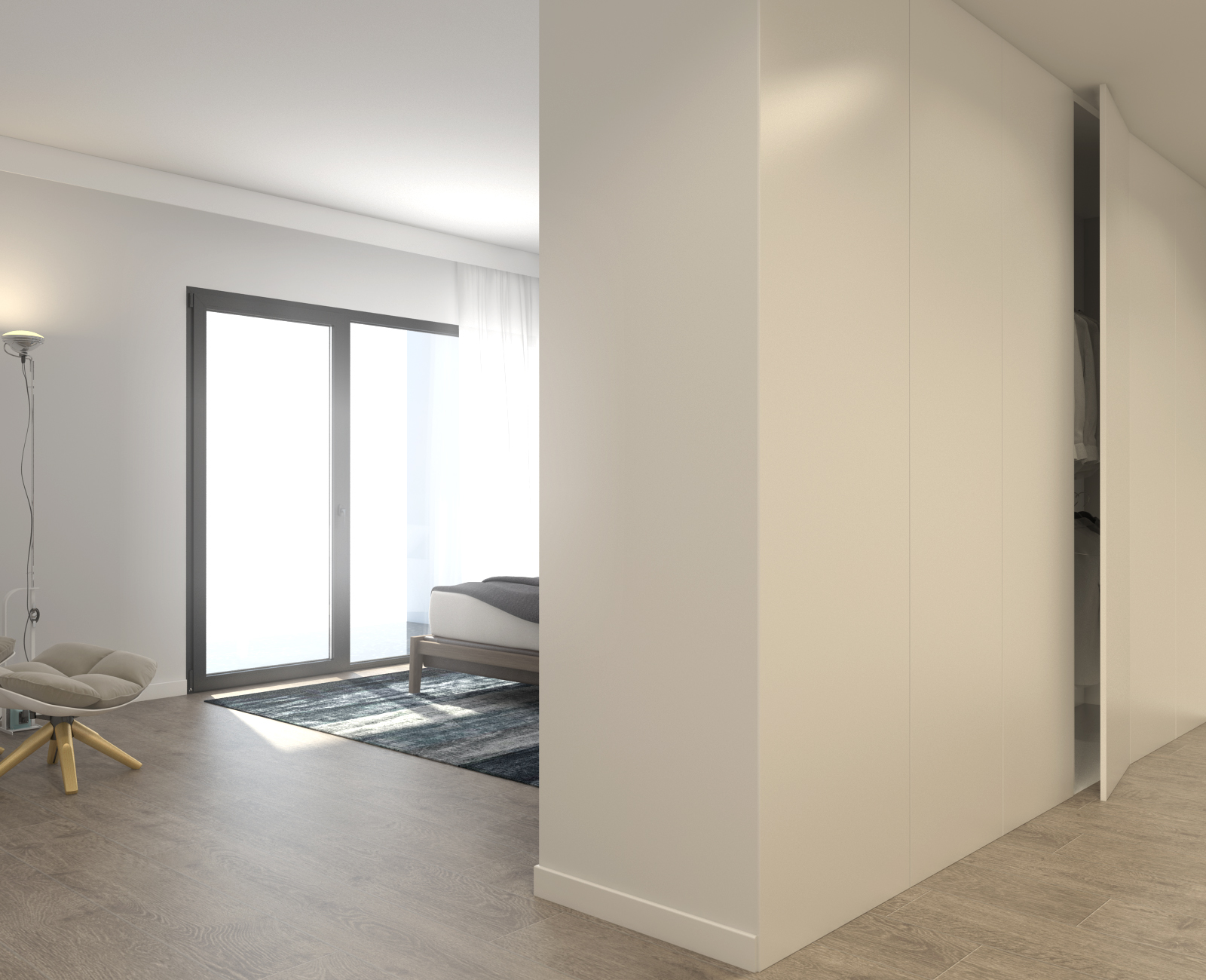 - Roupeiros brancos, forrados e divididos com parteleiras gavetas e varões.