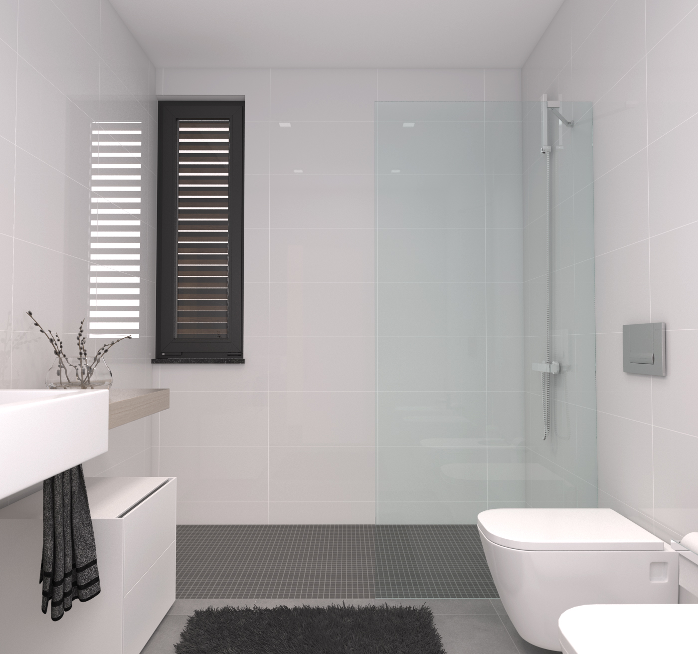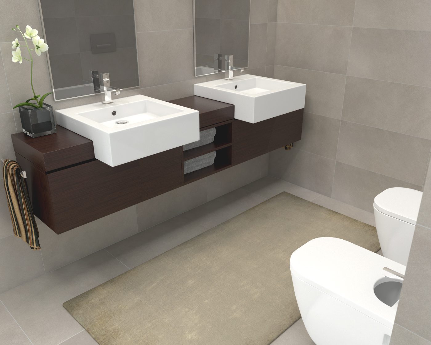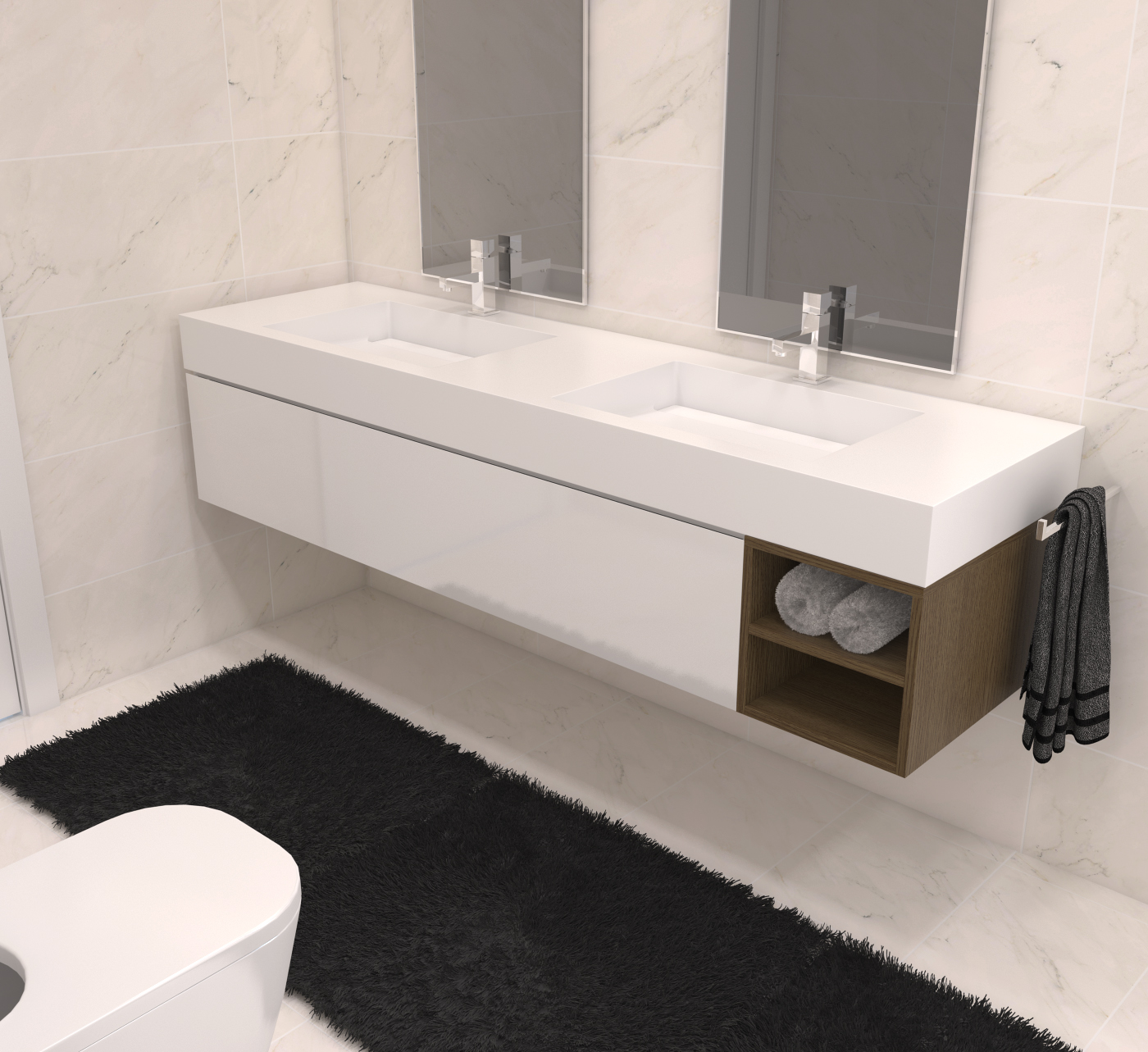 - Móveis suspensos com design moderno com tampos em pedra natural polida;