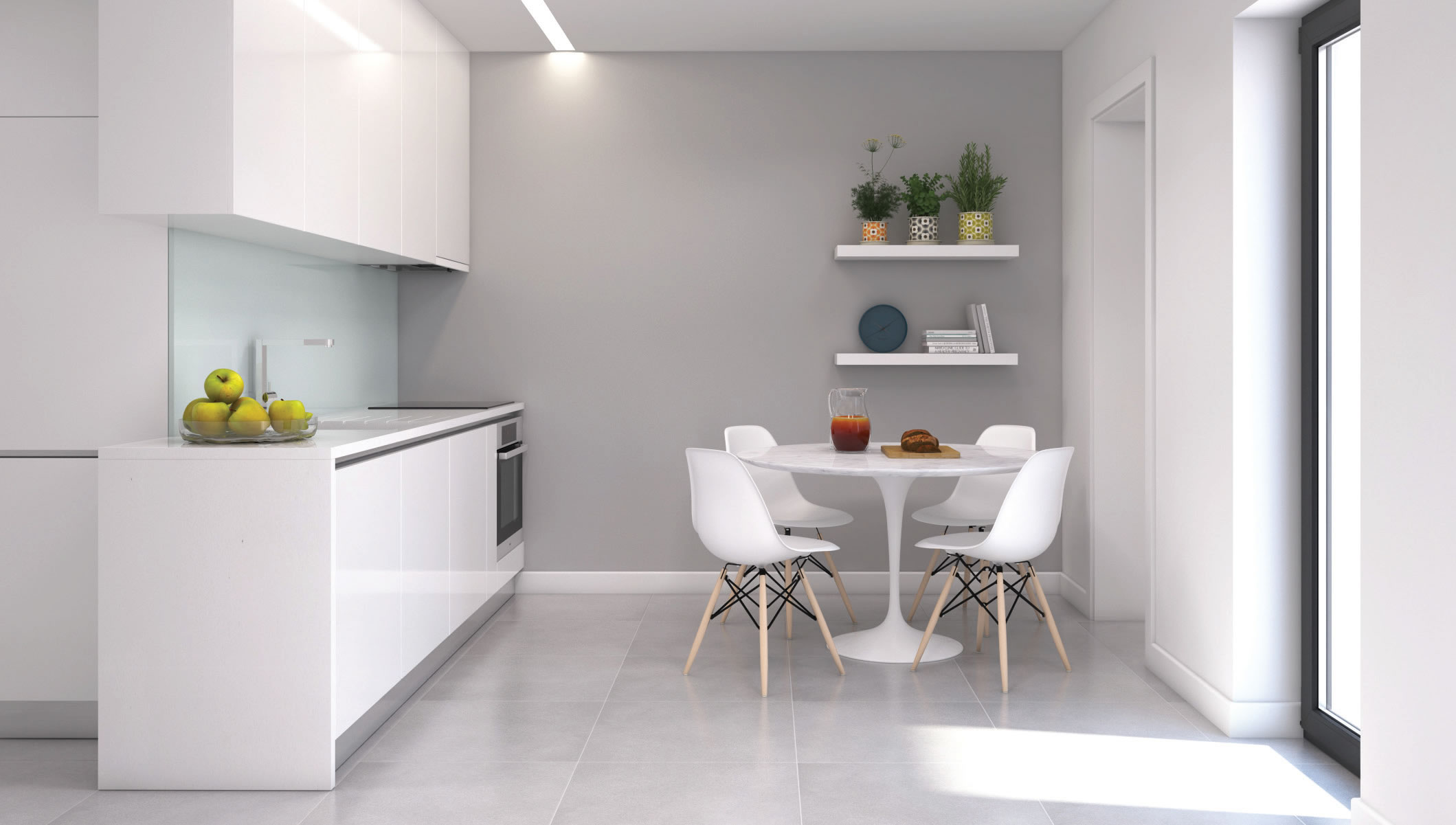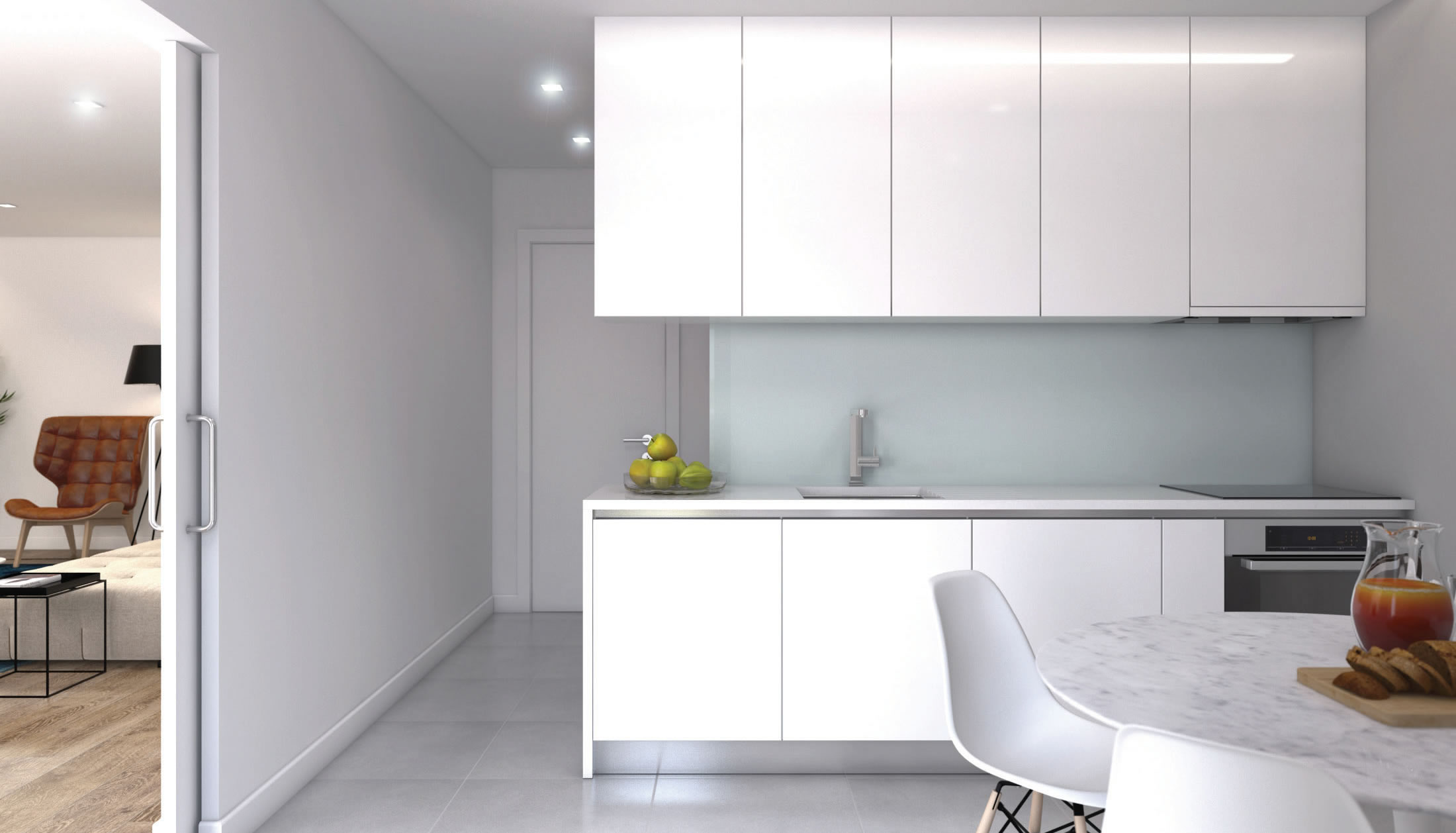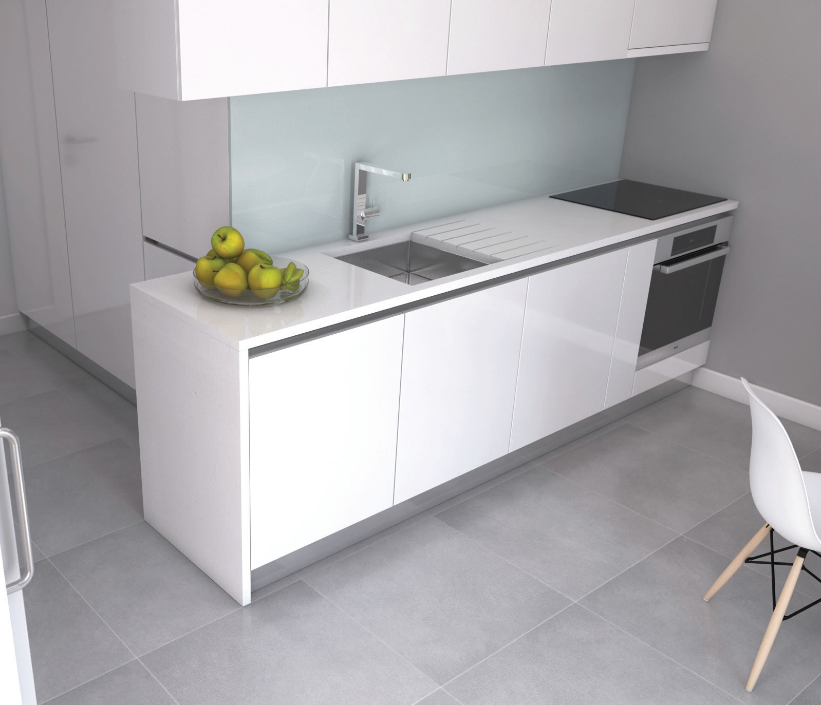 - Revestimento em grés cerâmico polido retificado entre os móveis (cor a definir) ou vidro lacado